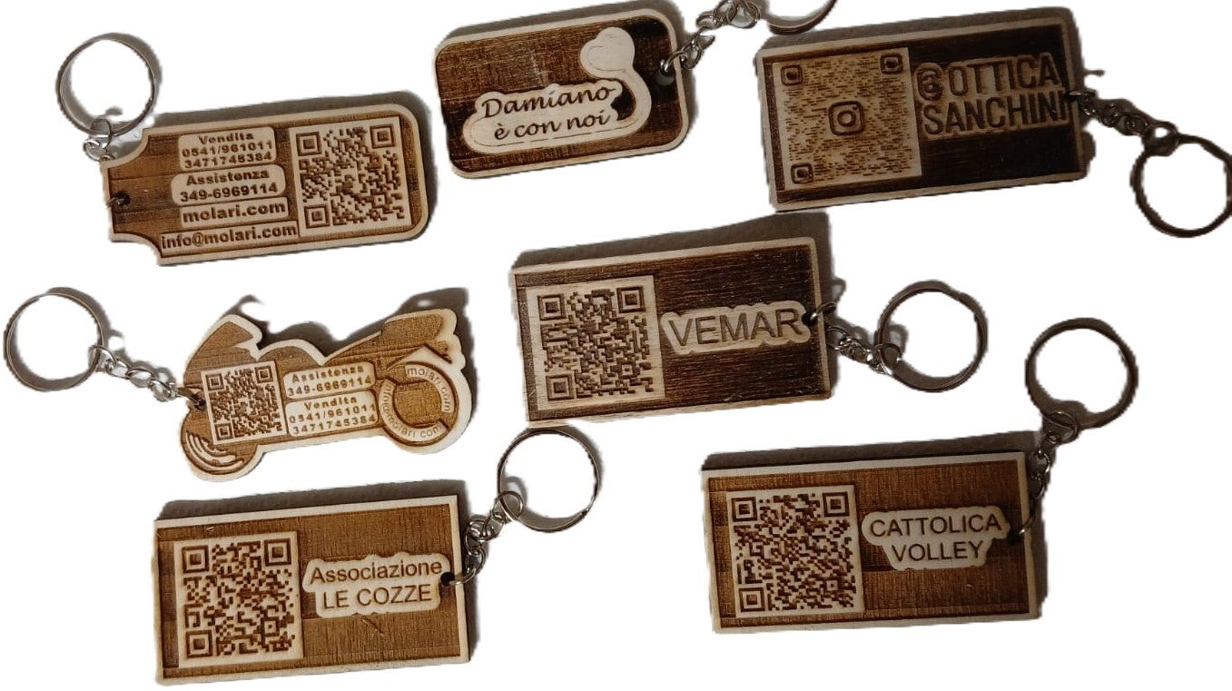 Uno dei nostri servizi esclusivi per le vostre attività, i Qr code con tutte le informazioni utili al cliente, incisi con maestria su oggetti di uso comune come i portachiave.